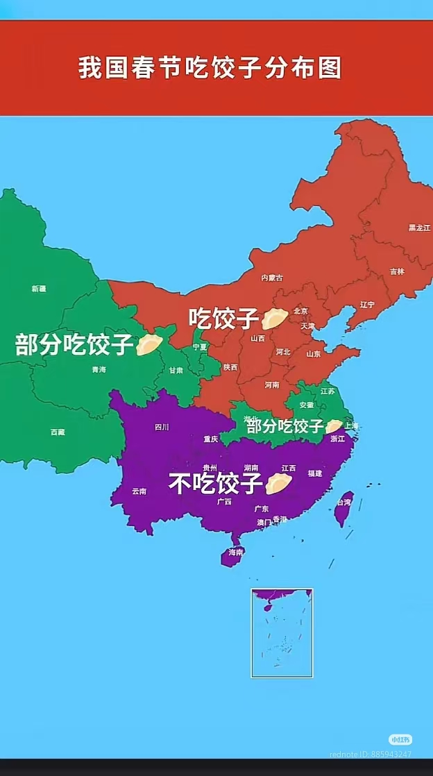 一张舆图发挥了年味的地域隔离:以湖北、安徽、江苏、上海四个部分吃饺子的省份为界,其东北区域过年吃饺子是传统,以南领先是不吃饺子的,西北五省则是有吃有不吃。