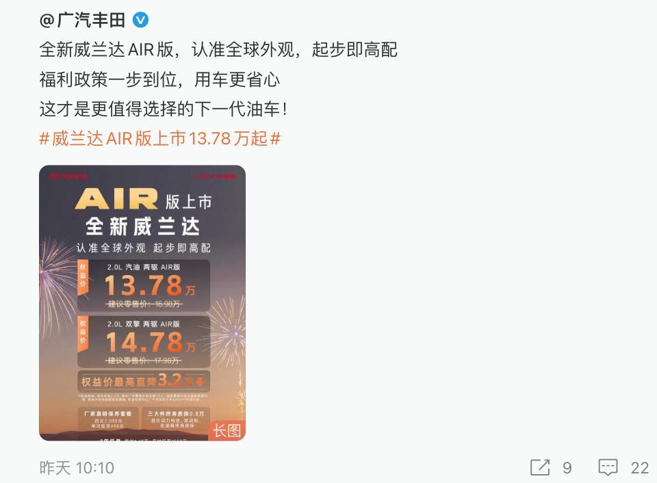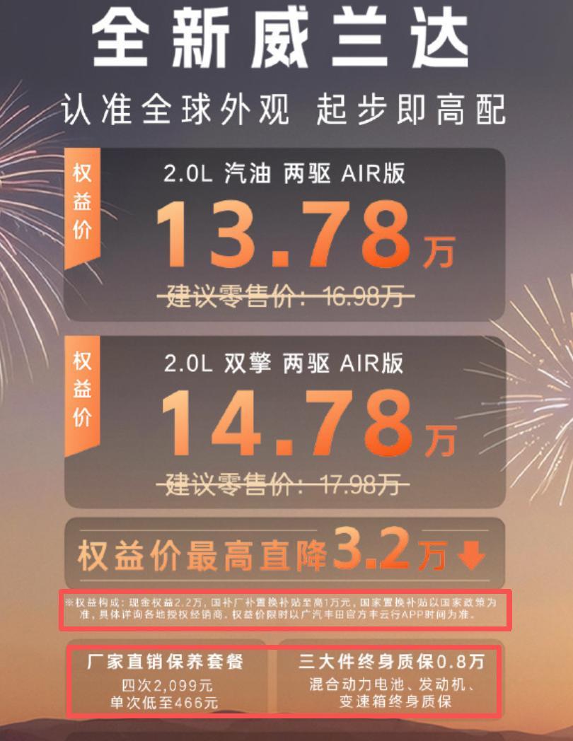 现时,这场由雅阁掀翻的马年车市争夺战仍在赓续。昨日,广汽丰田上新燃油车威兰达AIR版,限时现款补贴2.2万元、国补厂补置换补贴最高1万元,休养套餐也由广汽丰田直销。