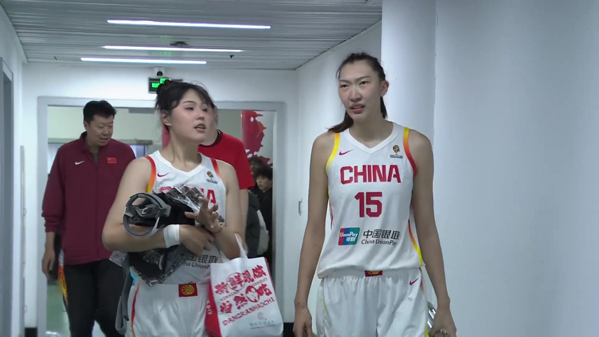 赛后复返更衣室时,李月汝和韩旭同业同样,中国篮球名宿王治郅给张子宇面授机宜。